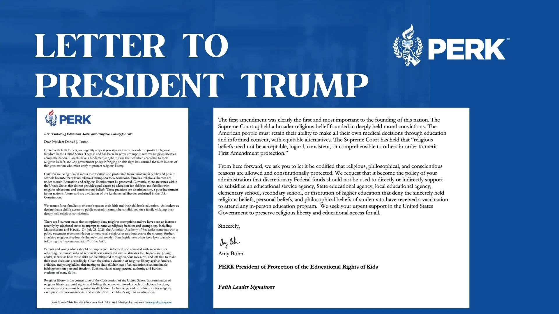 Here’s an important update on the powerful work PERK is doing on your behalf to actively protect you and your family. We recently sent a letter to the President of the United States, HHS Secretary Robert F. Kennedy, Jr., and the Office of Civil Rights, exposing the nationwide denial in specific states of religious exemptions, medical exemptions, and children’s access to education.