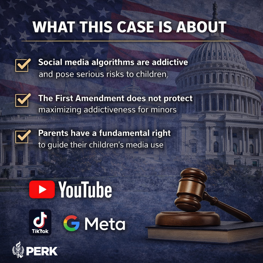 This case is about far more than social media convenience or corporate preference. It is about whether powerful digital platforms should be allowed to continue designing and delivering addictive algorithmic feeds to minors without meaningful limits, even as evidence grows that these systems can harm children’s mental health, sleep, development, and overall well-being. PERK’s brief makes the case that parents are increasingly being forced to navigate a digital environment that is intentionally engineered to capture and keep children’s attention.